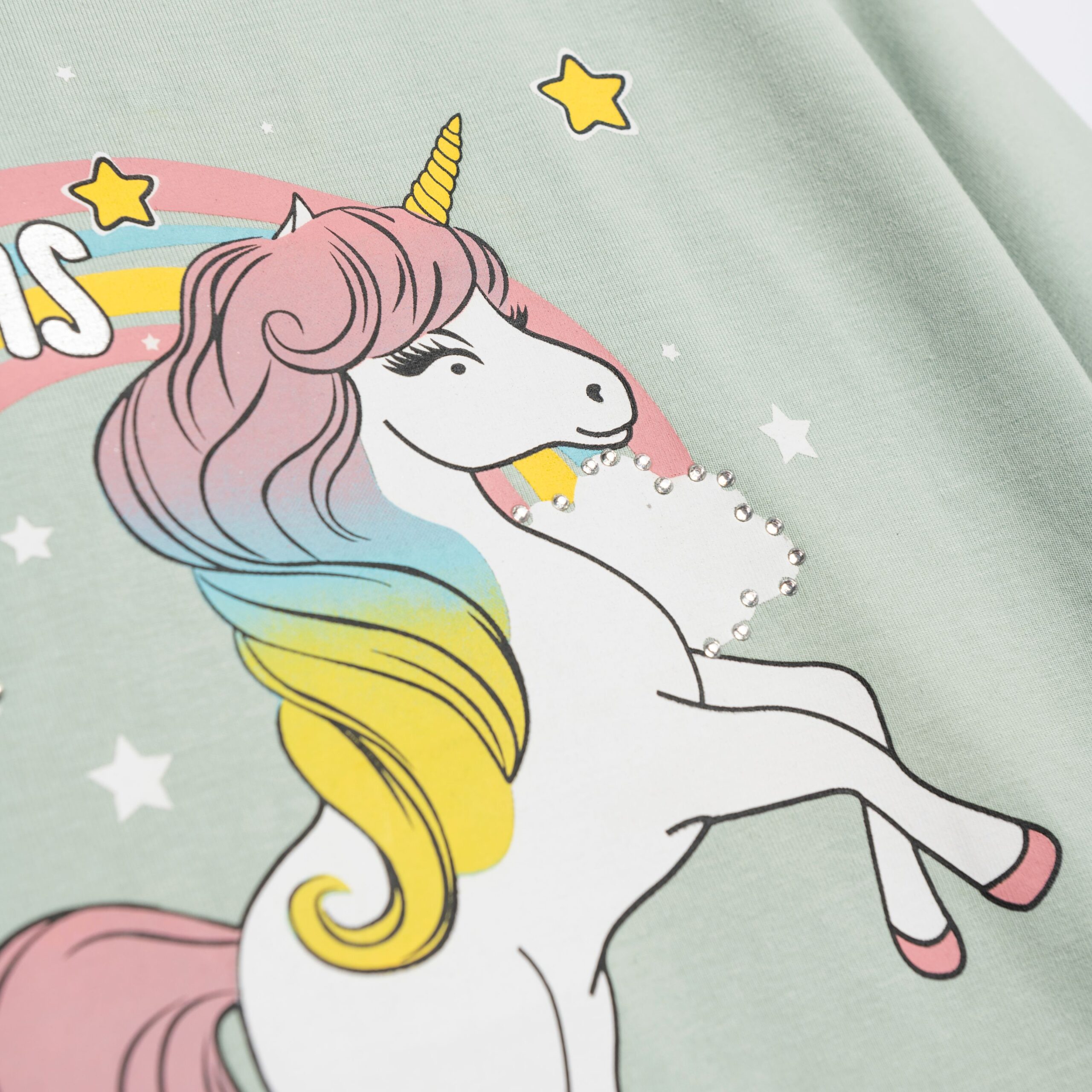 Μπλουζοφόρεμα με κολάν φούτερ λύκρα για κορίτσι σε χρώμα φυστικί/ μαύρο allover με τύπωμα (unicorn) στην μπλούζα