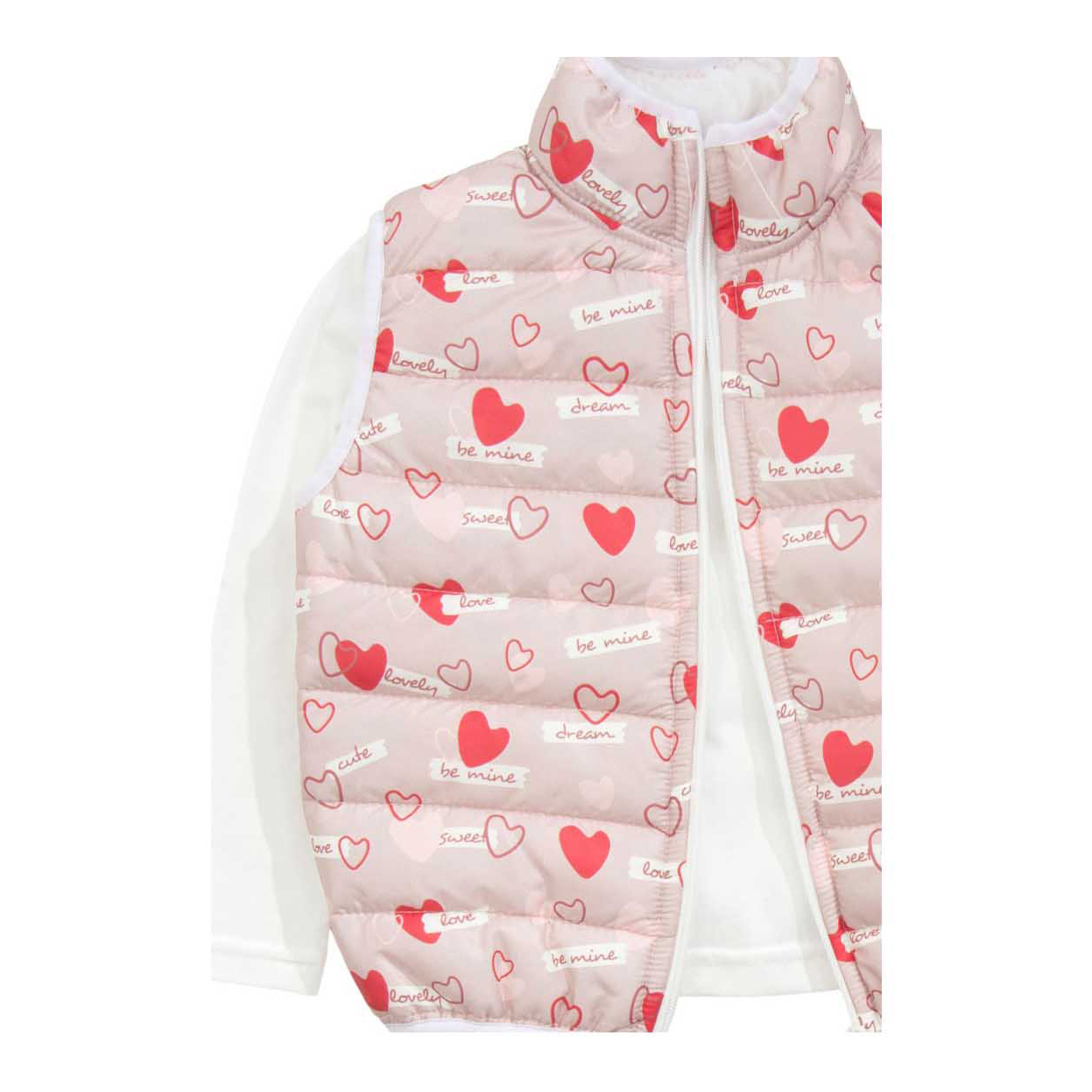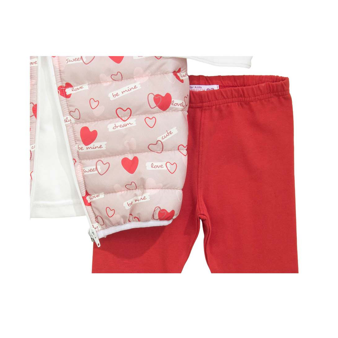 Συμπεριλαμβάνει αμάνικο γιλέκο με ολόσωμο τύπωμα καρδιές, μπλούζα με μακρύ μανίκι σε εκρού χρώμα με τύπωμα καρδιά και κολάν σε χρώμα σαγκουίνι.