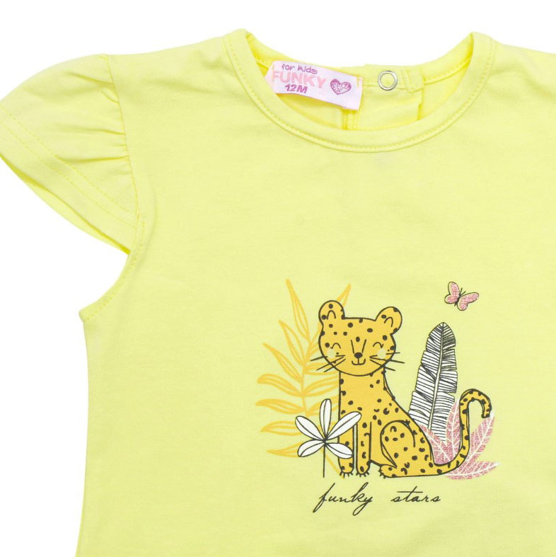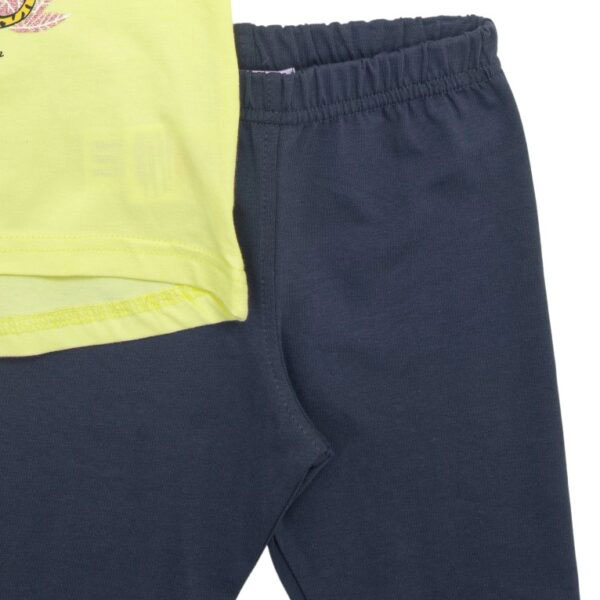 Μπλουζ/μα και κολάν για μηνών κορίτσι, μπλουζ/μα με μικρές σούρες στα μανίκια και τύπωμα σε βούτυρο χρώμα, και κολάν κάπρι σε ανθρακί χρώμα.