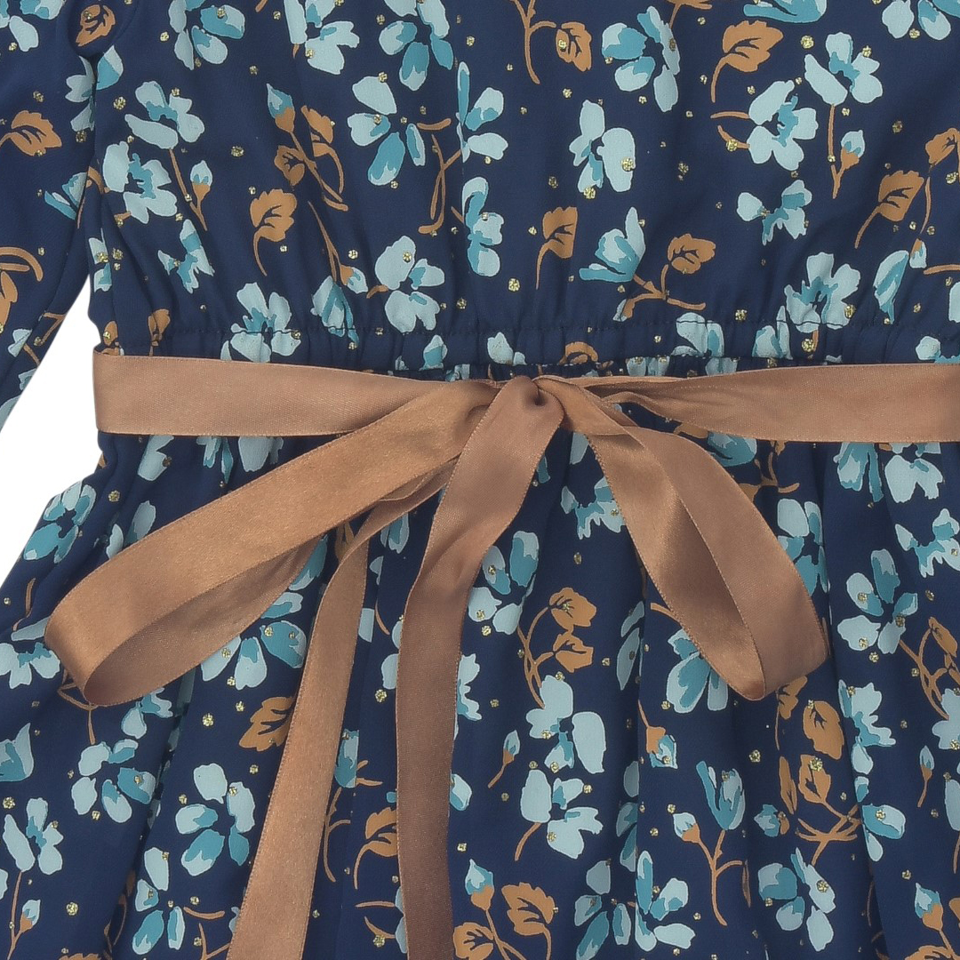 Φόρεμα με ραφή στην μέση και σούρα, ζώνη σατινέ κορδέλα και άνοιγμα με φερμουαρ πίσω,για κορίτσι από 1 έως 6 ετών. Σε χρώμα μπλε με τύπωμα εμπριμέ λουλούδια σε όλο το ρούχο.